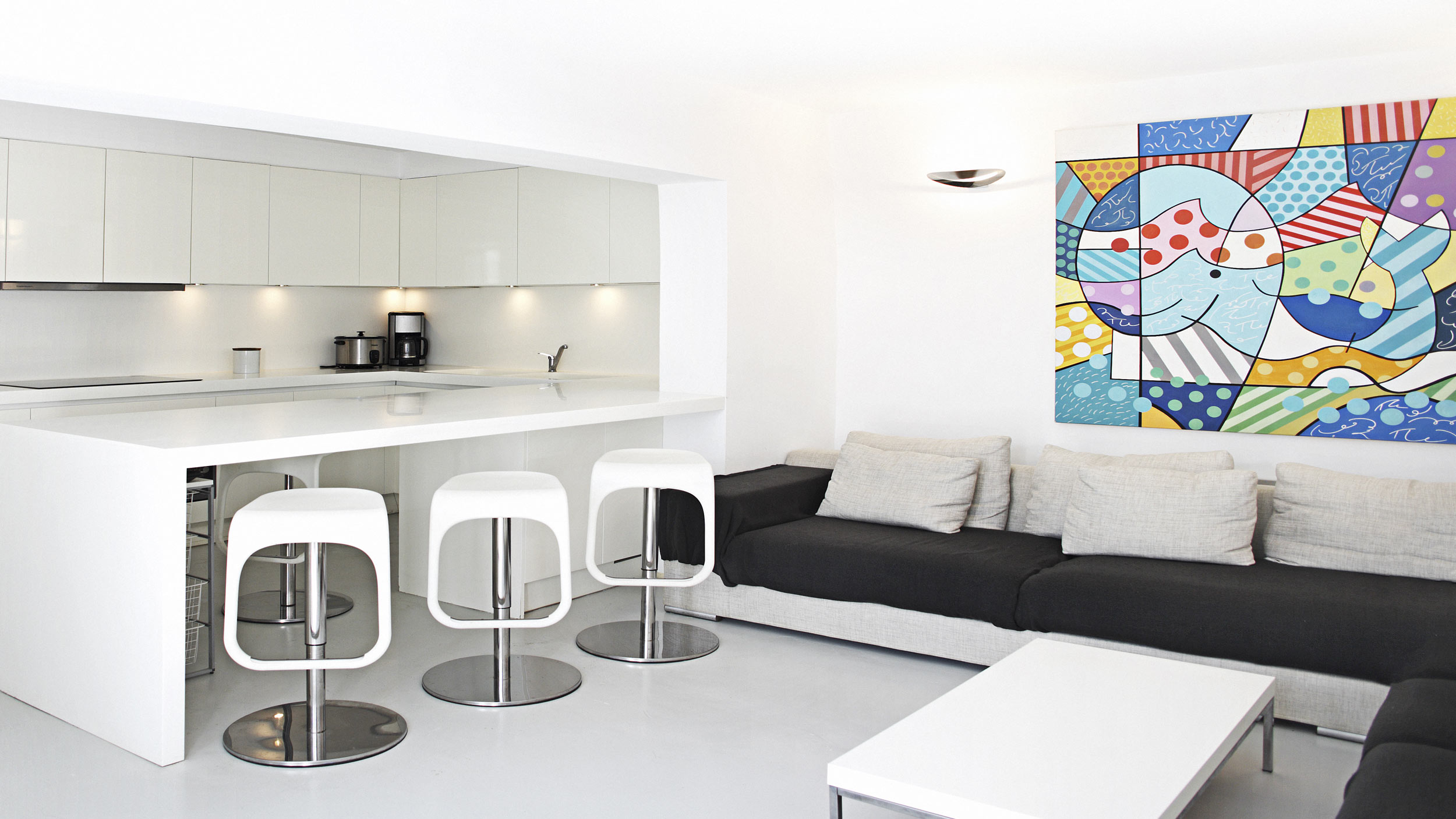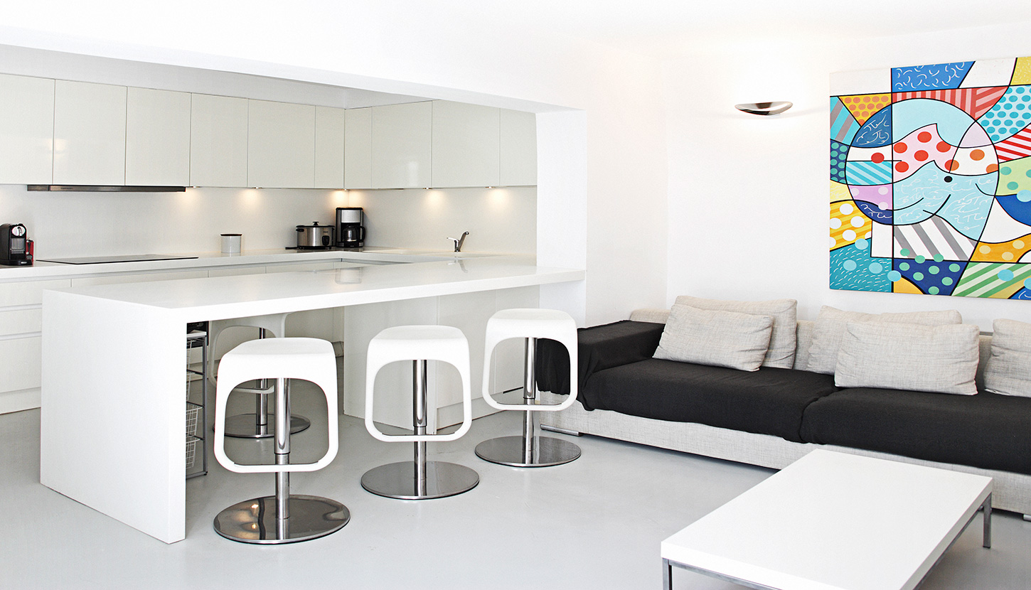 Underground level: Living room and fully equipped open plan kitchen. Laundry room. Staff bedrooms.